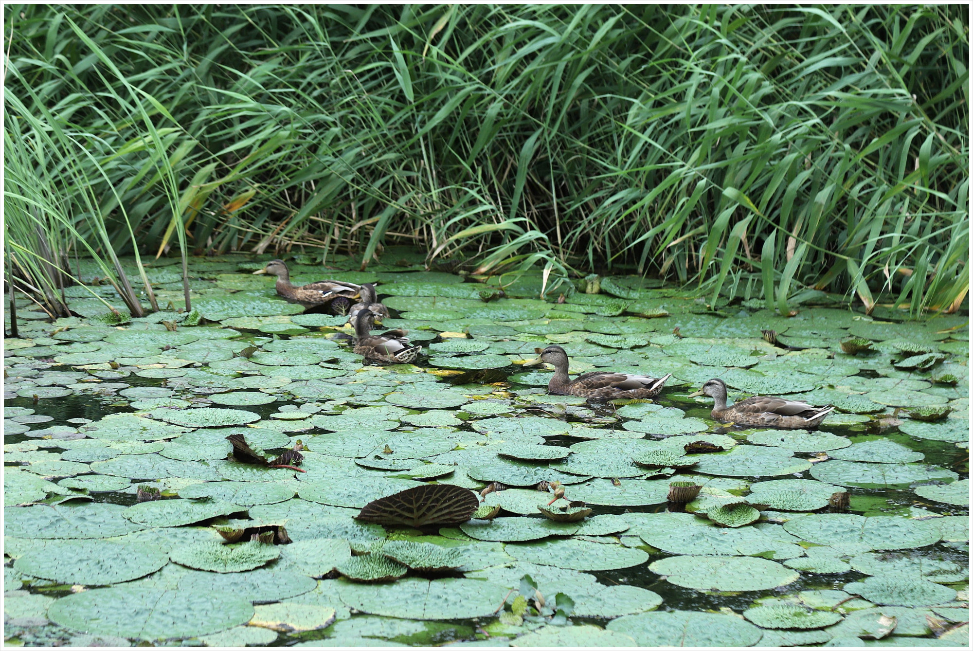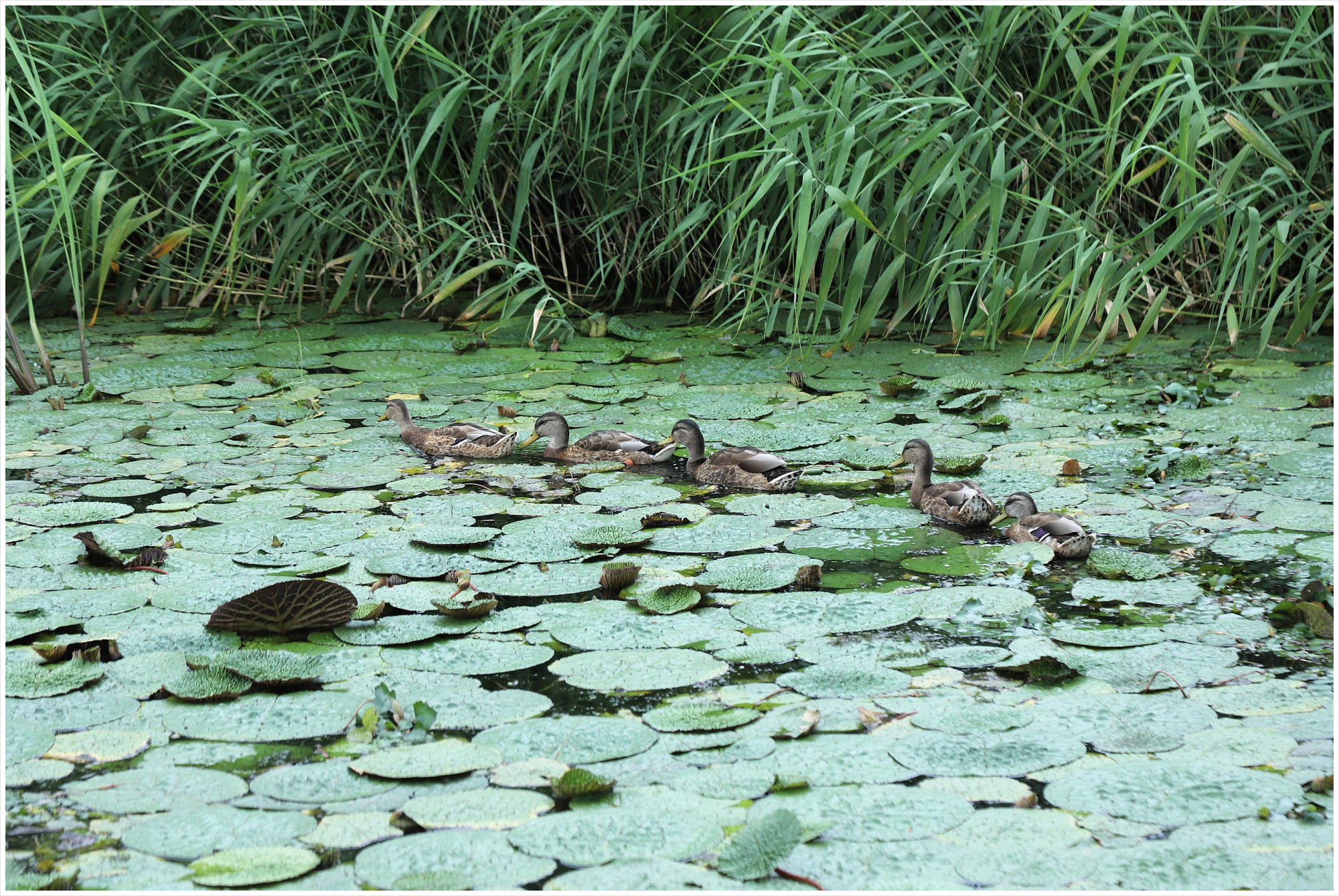 가시연 밭에 오리 다섯마리