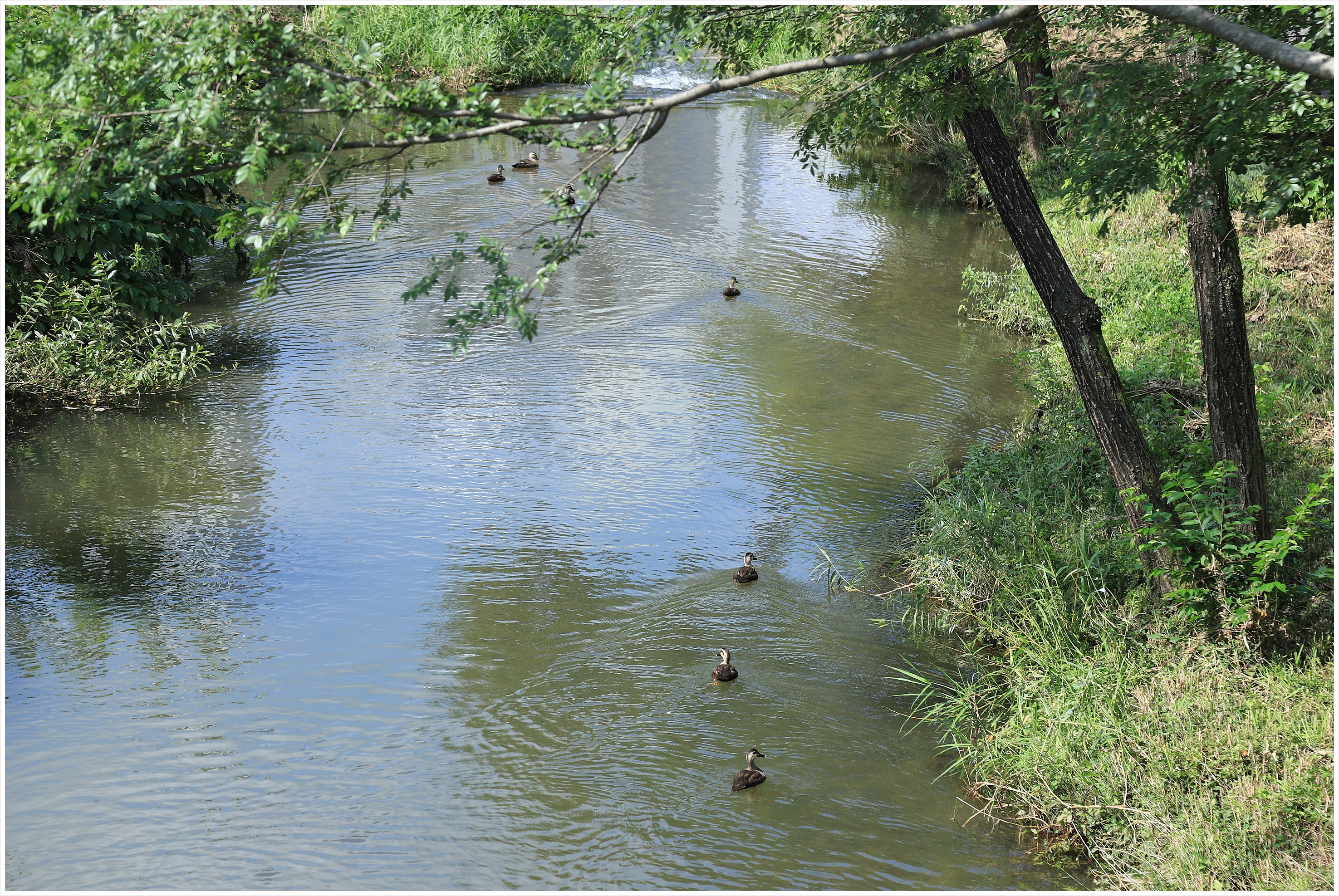 헤엄치는 오리들을 내려다보고...