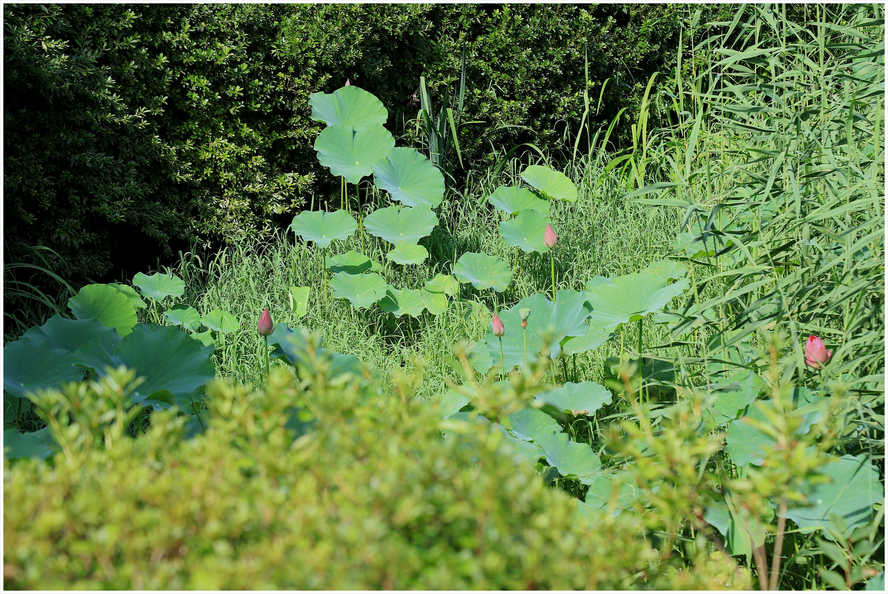 작은 연지에 연꽃은 아직이다.
